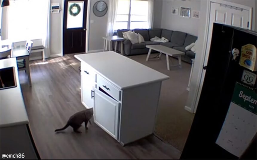 でもって、戸棚を開けるのが大好きな猫「ココ」を飼っている飼い主は、家にいない間にいたずらをされないよう監視カメラを設置した。