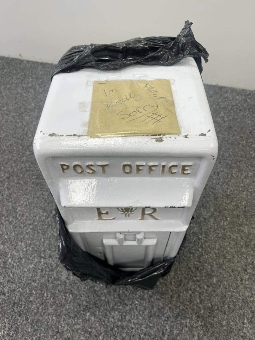郵便ポストが返却されました。公園で、黒い袋の中に入った状態で見つかりました..そこには、手紙と20ポンドが同封されていました。