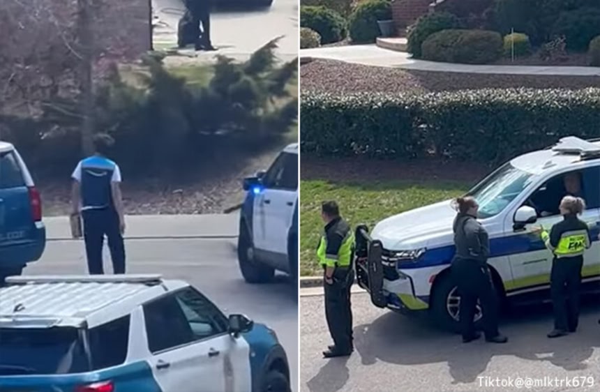 そんな矢先、この建物に住む居住者からの荷物を持ったAmazonの配達員がやってきた。配達員はたくさんのパトカーや警官たちに動じることなく建物に向かって歩いてきた。