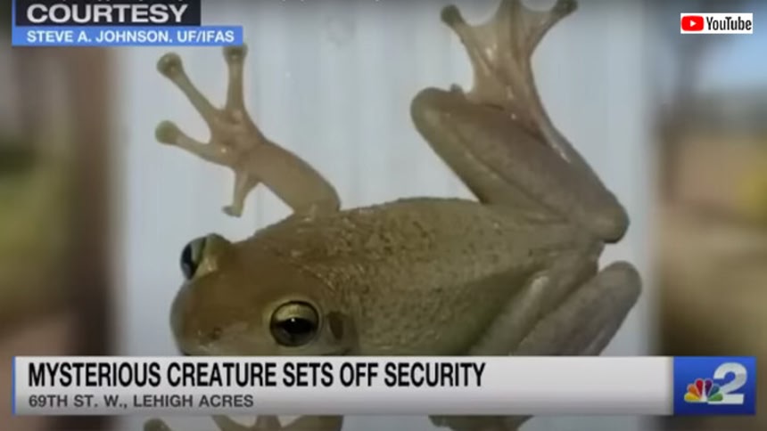 なんとその夜、今度は家の正面側の防犯カメラに何かが飛びつき映り込んだのだ。警告音を聞きつけて見てみると、今回は特徴的な脚と大きな目でカエルだとわかったそうだ。