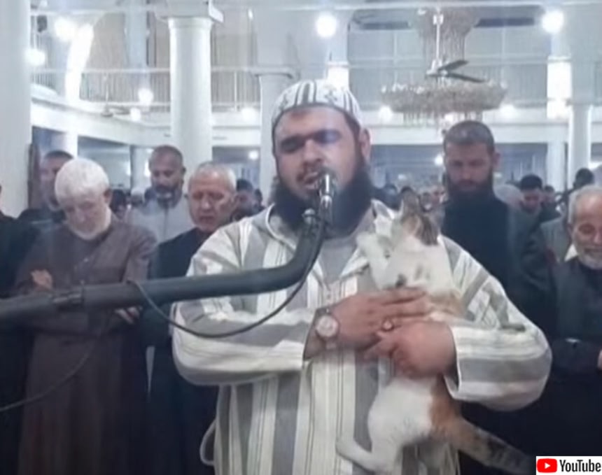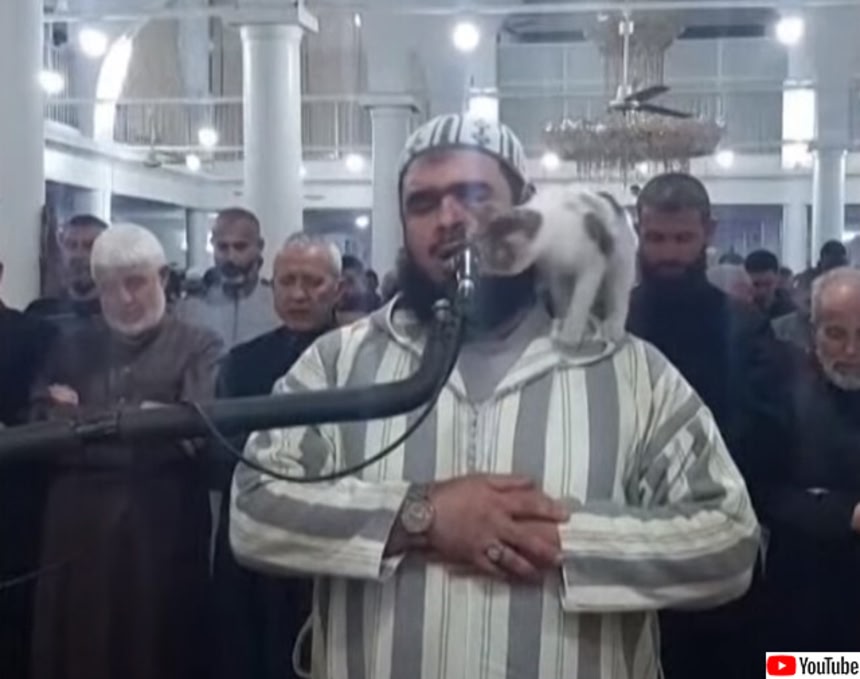 ラマダンの祈りの最中、導師の肩に猫が飛び乗るハプニング