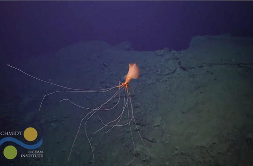 今回この深海イカが、無人潜水艇によりオーストラリア沖の水深約2000メートルの海底で観測され、撮影することに成功したそうだ。