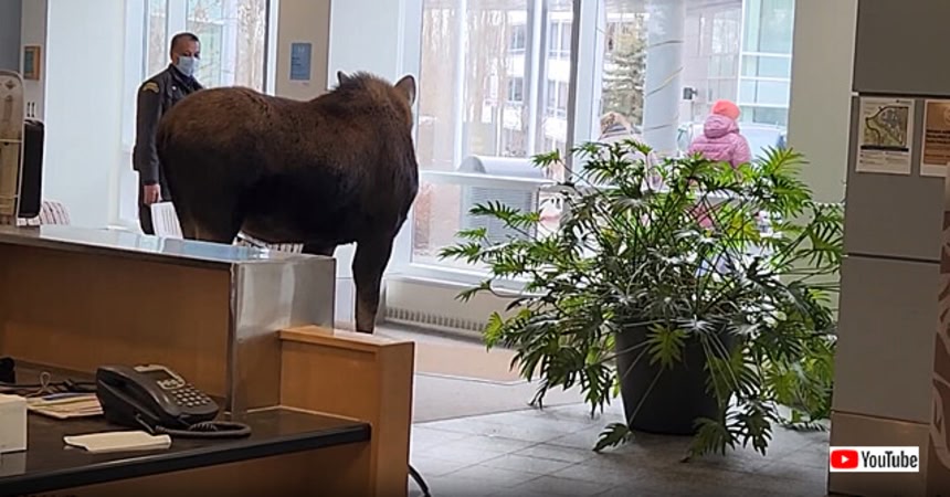 野生動物が多数生息するアラスカでヘラジカはよく見かける動物の一種だが、目撃者によるとこのヘラジカは最初は外にいたが、ガラス越しにこの観葉植物をロックオンして正面玄関から堂々と入ってきたという。