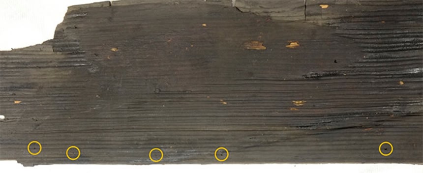 この画像を大きなサイズで見る盾の表面部分から、有機物の層の断片が見つかり、分析中です。しかし、穴をかがったような跡や、縁を面取り、または傾めに削ったような跡があり、板に保護層のようなものをとりつけるために細工したと思われる、間接的な証拠が見られます(ウォーミング氏)