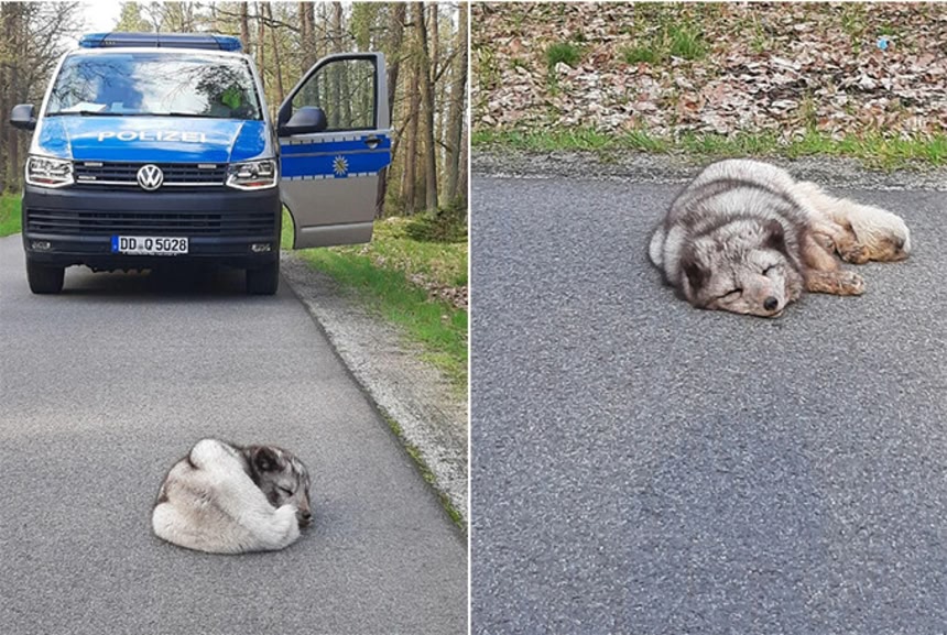 この画像を大きなサイズで見るドイツの動物園から逃げ出したホッキョクギツネが、道路の真ん中で眠っているところを警察に保護された。