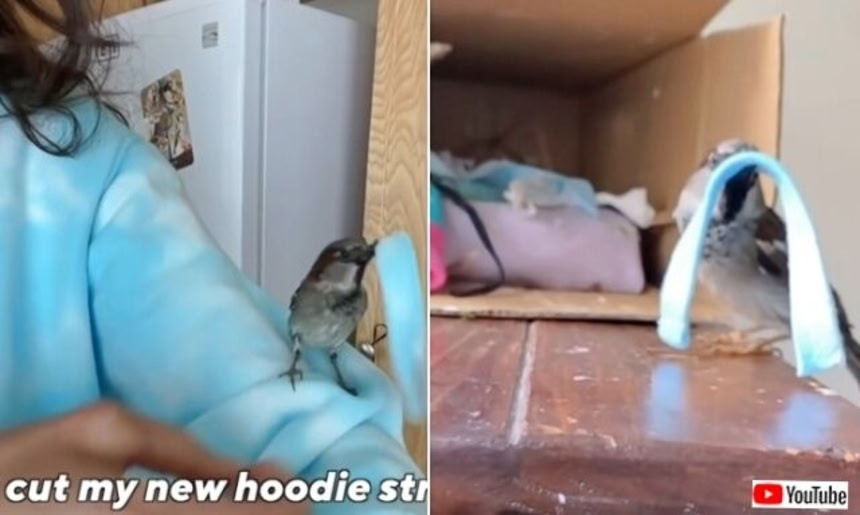 この画像を大きなサイズで見るある時、マリアさんの来ていたパーカーの紐を欲しがったハッピー。新品だったパーカーの紐を切って与えると、なんとハッピーは巣作りを開始。