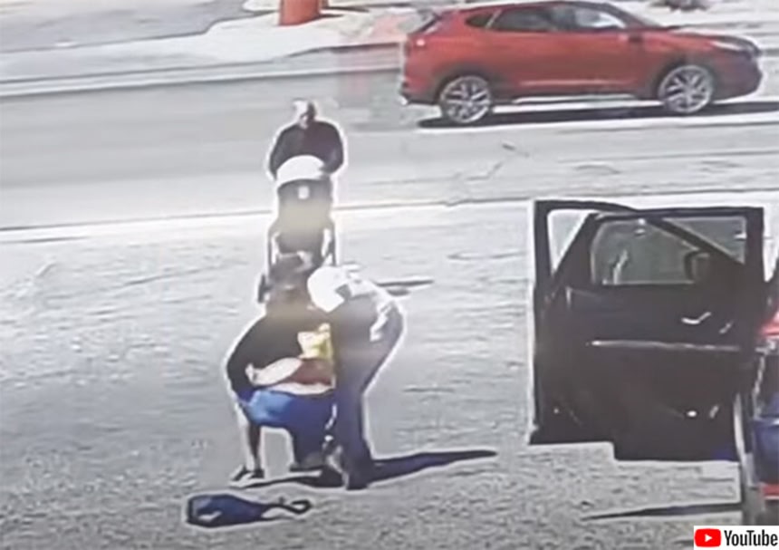 女性が車から赤ちゃんを下ろし、ベビーカーに乗せたところ、強風にあおられて交通量の多い道路へ向かって押し出されたのだ。女性はベビーカーを止めようとするも転倒し、起き上がるもまた転倒。