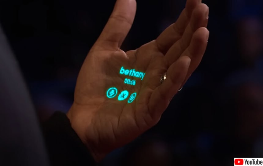 きっとあなたは、「ピロピロ♪」と呼び出し音が鳴って、チャウドリ氏の手に投影された拡張現実スクリーンに目を奪われるだろう。彼はそれを見て、妻から電話があったことを知り、ただ「もしもし」と答えるだけで電話に出る。