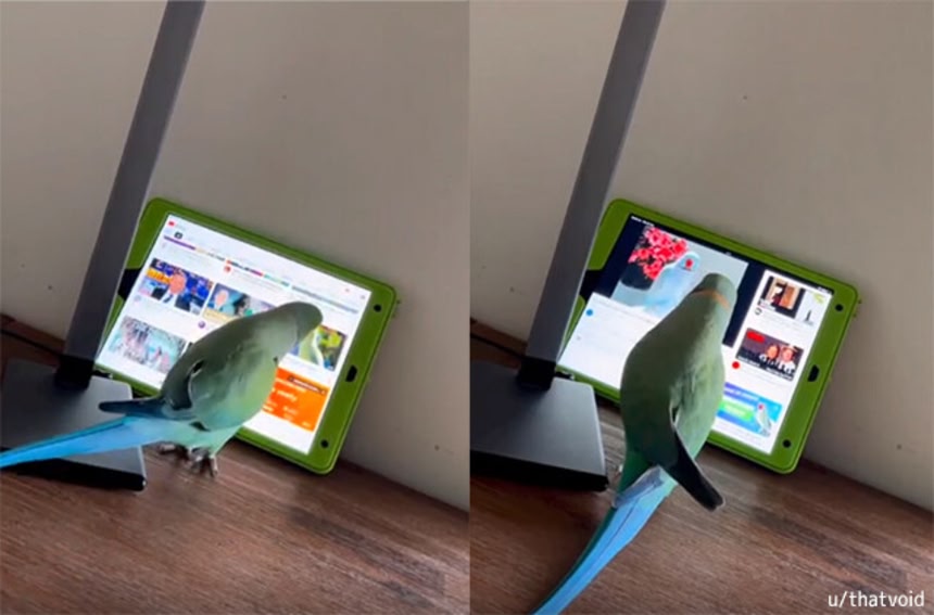 この画像を大きなサイズで見るだがインコはその動画は見たくなかったようだ。すぐにまた画面をスクロールし、その中から見たい動画を選んでくちばしクリック。