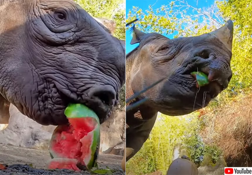 そんなサイにスイカを与えたところ、角を上手に使ってスイカ割りを始めた。角度を調節しながらグシャっとちょうどいい感じにつぶれたようだ。