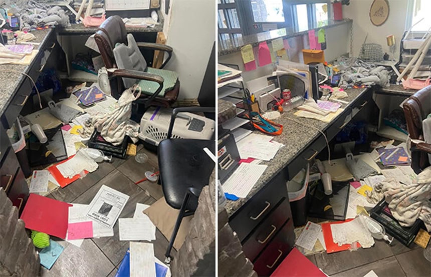 タイタンは、事務所のコンピューターを破壊し、ブラインドを取り壊し、書類におしっこをかけ、すべてのカウンターをめちゃくちゃにして、ゴミや書類を噛み砕いていました。