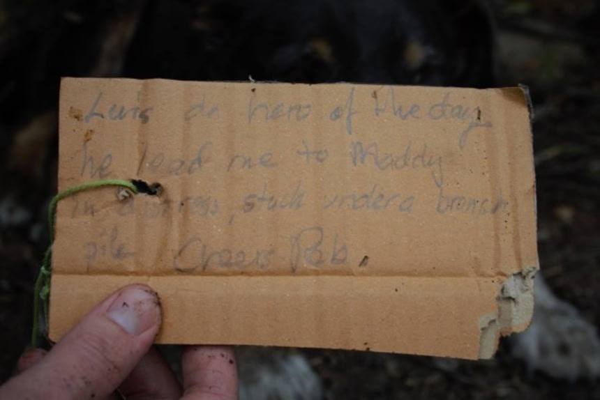 ロブさんは、マディを助けてくれたお礼にと、たっぷりの水とビスケットをルイに与え、万が一ルイの飼い主が帰りが遅いルイを心配していてはいけないと思い、メモをつけてルイを見送った。