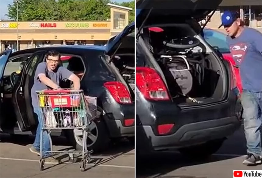 3人組のうち1人はドアを開け、もう1人は物が詰まったカゴを後部座席に投げ込み、もう1人はショッピングカートいっぱいに詰め込んだ物を車に乗せようと悪戦苦闘していた。