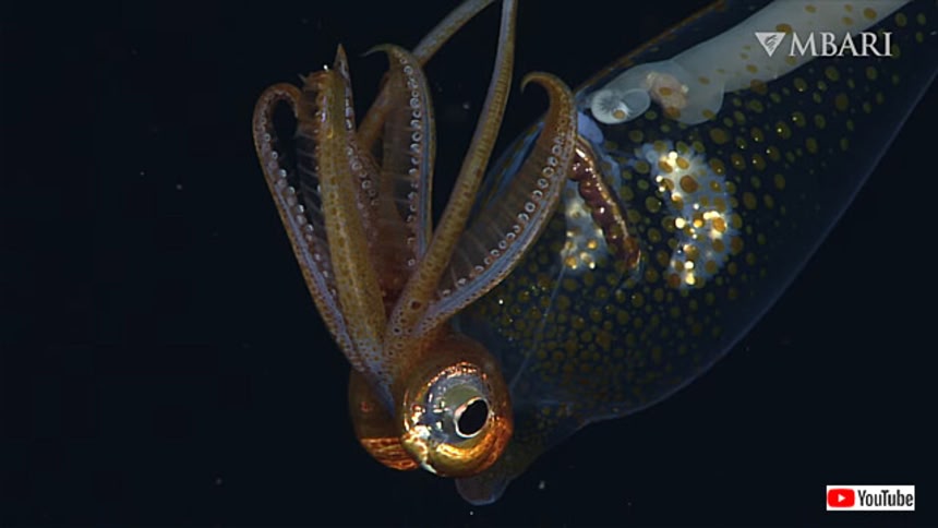 動画を公開したモントレー湾水族館研究所 MBARI によると、このイカの名はガラスイカ(glass squid)。開眼目サメハダホウズキイカ科の一種だそう。