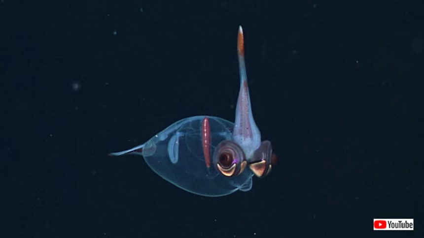 ガラスイカは海のトワイライトゾーン深海に生息し、驚異のカモフラージュ能力で天敵から身を守りながら暮らしている。