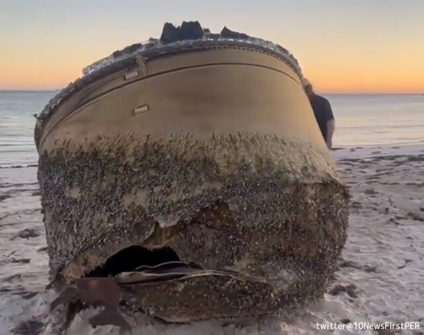 References:Mystery object: Australian police warn public away from huge cylinder found washed up on WA beach | Western Australia | The Guardian / Experts warn public after ‘hazardous’ spacecraft washes up on beach / written by parumo