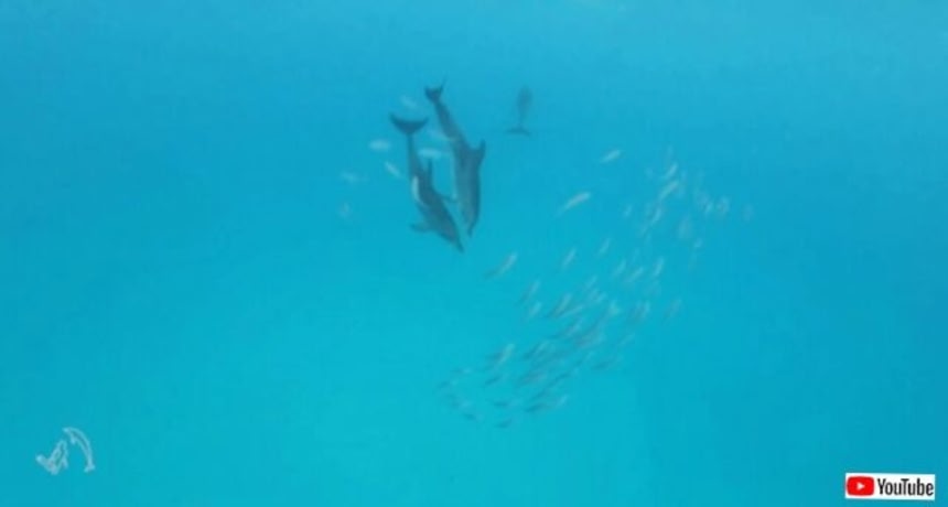 この画像を大きなサイズで見るこのイルカたち、実は食事中だったんだ。水中ではご覧の通り、小魚の群れがベイト・ボールを形づくって、イルカたちから逃げまどっている。