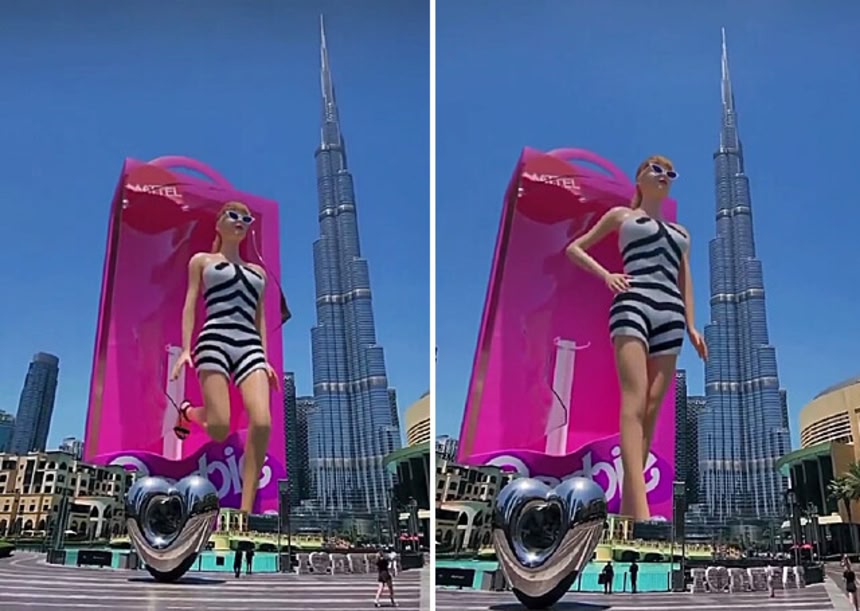 ドバイの世界一高いビル、ブルジュ・ハリファを背景に、身長およそ600メートルのバービーが歩き出すシュールなシーンが一気に話題に。