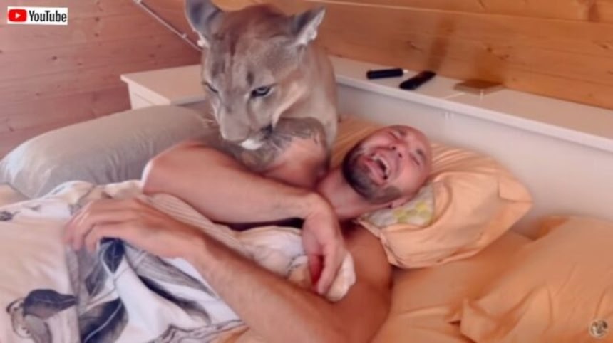 ロシアで暮らす家ピューマのメッシくん。ご主人のサーシャさんを起こしに来たよ。「起きてよ、早く遊ぼうよ」と、ごろにゃんと甘えるメッシくんだが、ピューマだけに少々お肌への刺激が強いようだ。