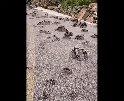 集中豪雨の後、舗装された道路の表面がボコボコと突起していたのだ。まるで路上が巨大フジツボに覆われたかのような奇妙な光景だ。