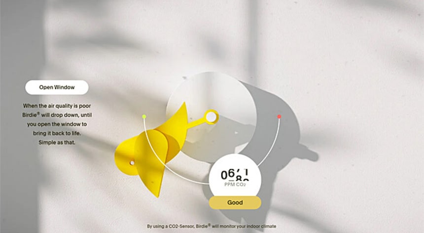 炭鉱のカナリアがヒントの Birdie は、壁掛けタイプのエアチェックモニター。二酸化炭素センサー内蔵の黄色いカナリアが空気を常時監視する。