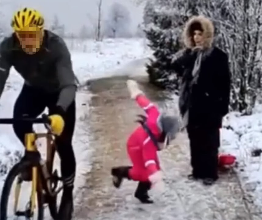 この画像を大きなサイズで見るベルギーで、自転車に乗った男性が5歳の女の子を転ばせ、そのまま走り去った映像を、撮影していた父親がSNSに投稿した。