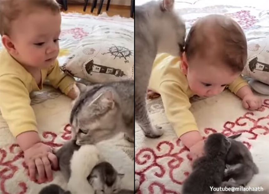 前カラパイアで人間の赤ちゃんがいるところに母猫が赤ちゃん連れてきた動画あったね🤭一緒に赤ちゃんをまとめてお世話ブースにしたいような感じだった。赤ちゃんは赤ちゃんってわかるのがすごいね。スリスリもしてるし大切で仕方がないんだね。そんなお母さん猫がまた可愛らしい😊🥰