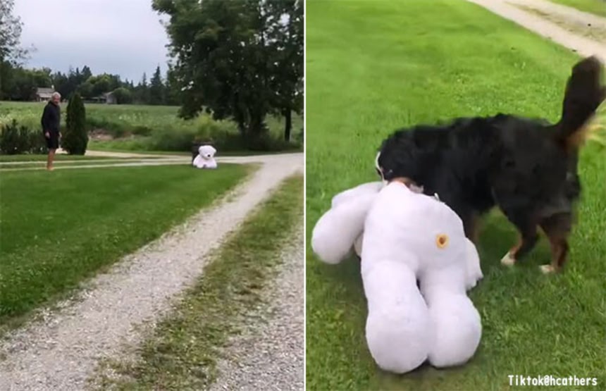 ちなみに、この動画の次にあげられた動画では、飼い主がハドリーを連れてスターバックスに行こうとしたとき、彼女がこの大きなテディベアを車に運び込み、一緒に連れて行こうとする姿がとらえられている。