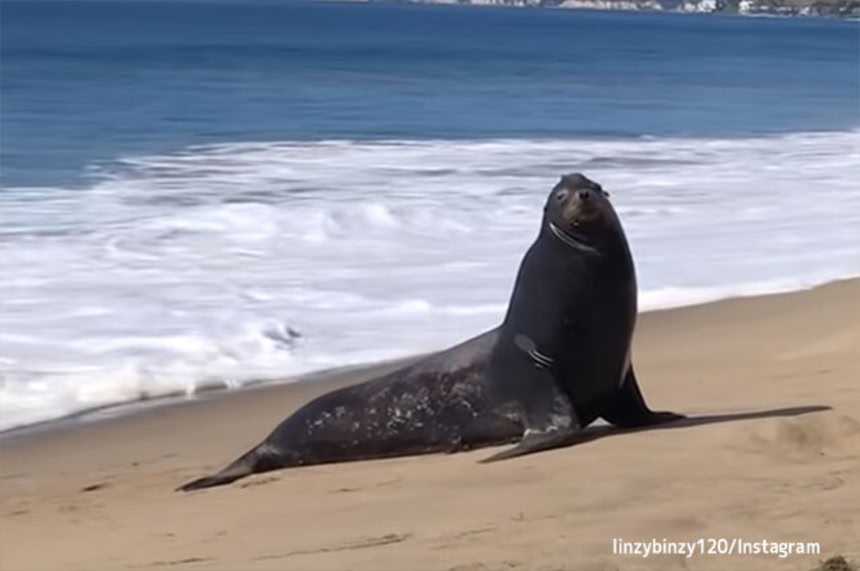 アシカは襲いかかったりすることなく、スリムの前で鳴き声をあげながらビーチに寝そべった。