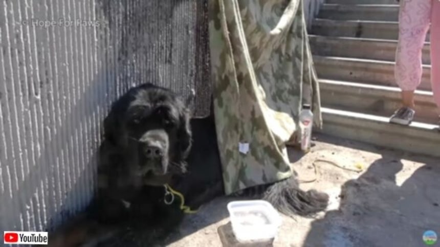 現場に着くと、そこにいたのは1匹のニューファンドランド犬だった。通報してくれたのは、爬虫類と両生類の保護活動をしているサビーネさん。彼女によると、犬は少なくとも一晩ここにいて、飲まず食わずなんだという。
