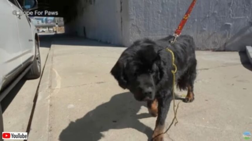 この画像を大きなサイズで見るどうやらホームレスに飼われていた犬が、何かの理由で置き去りにされてしまったらしい。エルダードさんが首にリードをつけると、犬は素直に立ち上がって歩き出した!