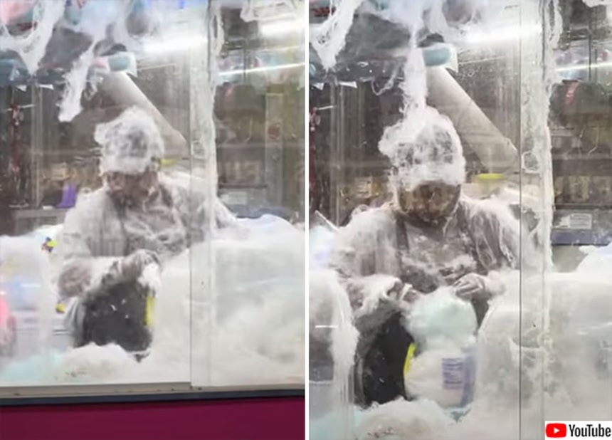綿菓子屋の店員が綿あめに包まれてんてこまい