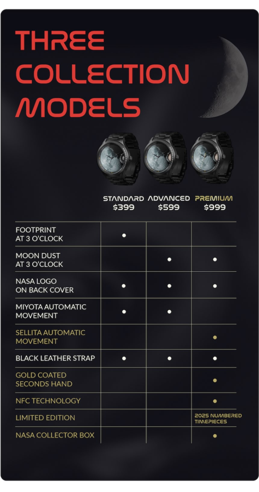 スタンダード:月の塵は無し。代わりにニール・アームストロング氏の足跡。ムーブメントは日本のミヨタ(MIYOTA)製。ケースはステンレス。 $399(約59,800)