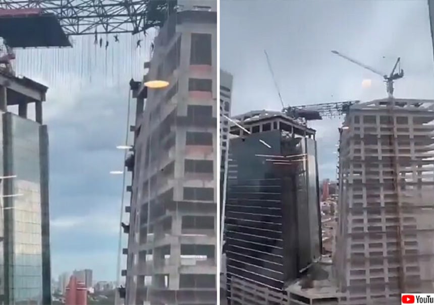 高さおよそ140メートルのツインタワーの建設中、連絡橋部分に渡してあった足場が急に崩れ、そこで作業していた作業員らが宙づりになったのだ。