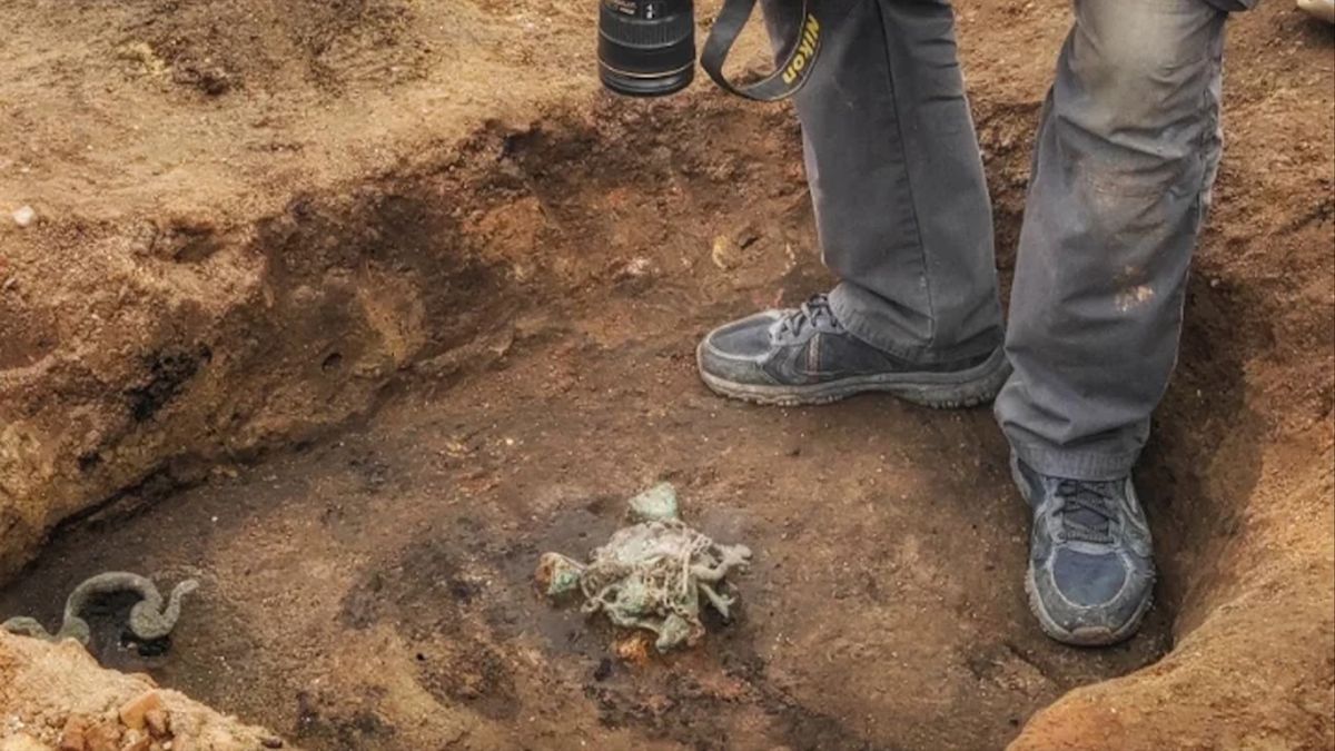 この画像を大きなサイズで見るヴィミナシウムで新たに見つかったティンティナブルムは青銅製だが、きちんと修復されるまで、土くれをつけたまま保存されている。