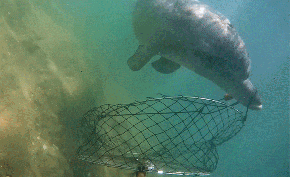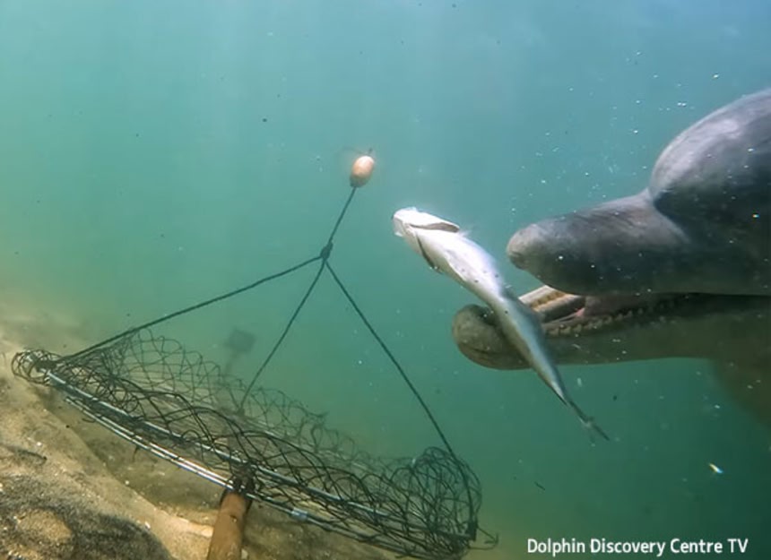 西オーストラリア州バンバリーにあるドルフィン・ディスカバリー・センターの撮影チームは、バンドウイルカがカニ漁の仕掛け網に口を突っ込んで餌の魚を回収している様子を捉えた。