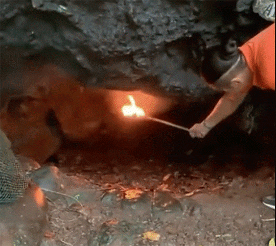 松明を灯し洞窟の中にかざすと、燃焼に必要な酸素が不足して火がすぐに消えてしまう。