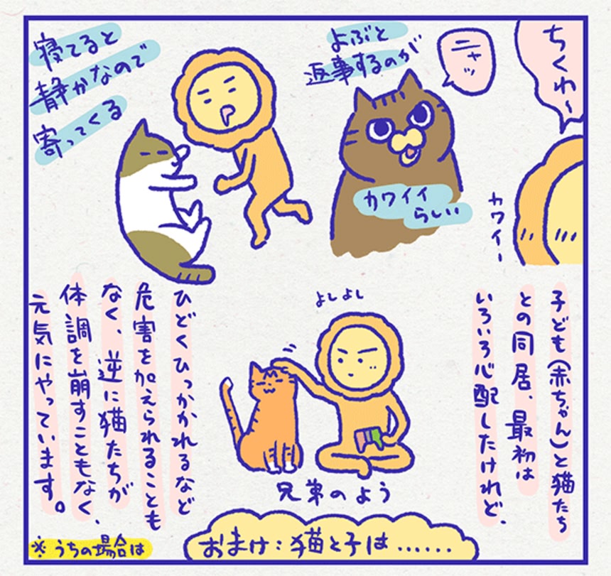 初めは猫たちがやきもちを焼くんじゃないか、子どもが猫をいじめたりするんじゃないか、ひっかかれるんじゃないか、なにか病気になるのでは?などいろいろと心配していたのだけれど、現在ではそれなりに良い関係を築いて暮らしている。