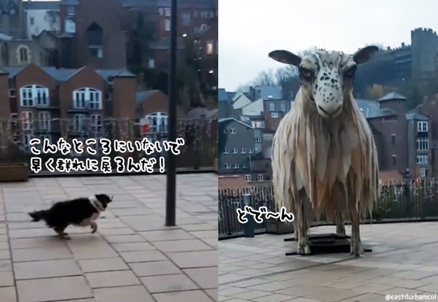 さてそんなボーダーコリーだが、お散歩中に巨大な羊の像と遭遇してしまう。「ちょ、おまえ何やってんだこんなところで、はやく群れに戻れ」とばかりに、その羊の像に吠え、誘導しようとしたのだ。