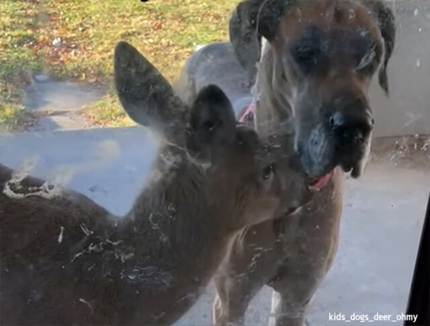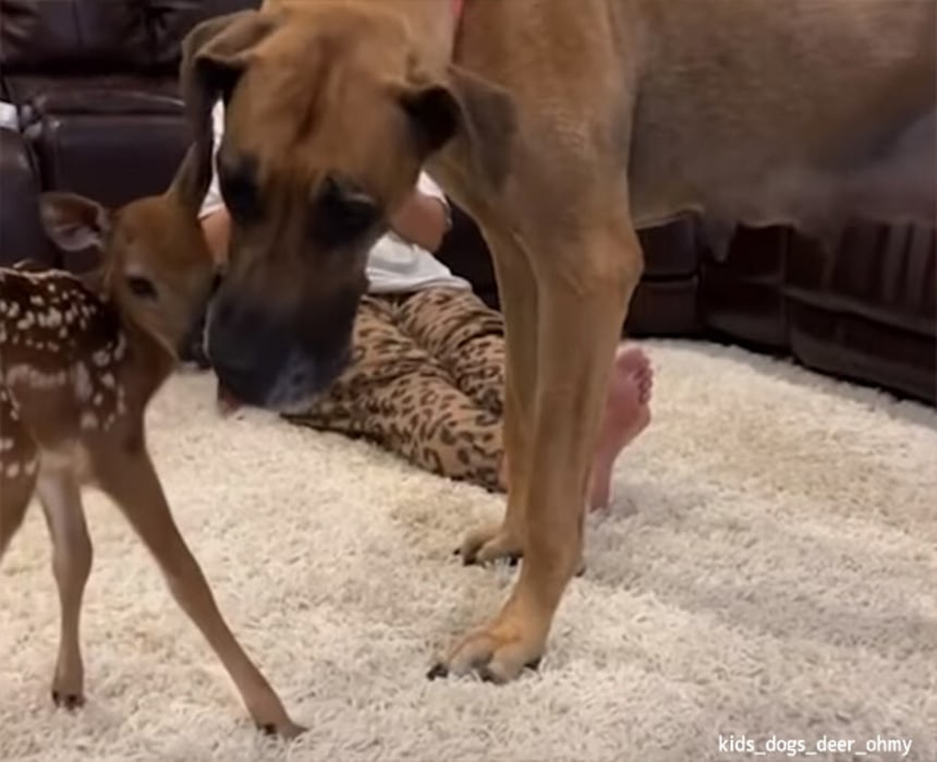 子犬と離れ離れになった母犬が孤児の子鹿と出会う