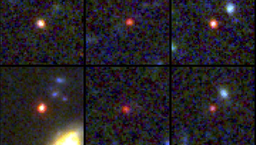 この画像を大きなサイズで見る今年JWSTが発見した宇宙の神秘の1つは、ビッグバンからわずか5億年後の宇宙黎明期に誕生した6つの巨大な銀河だ。