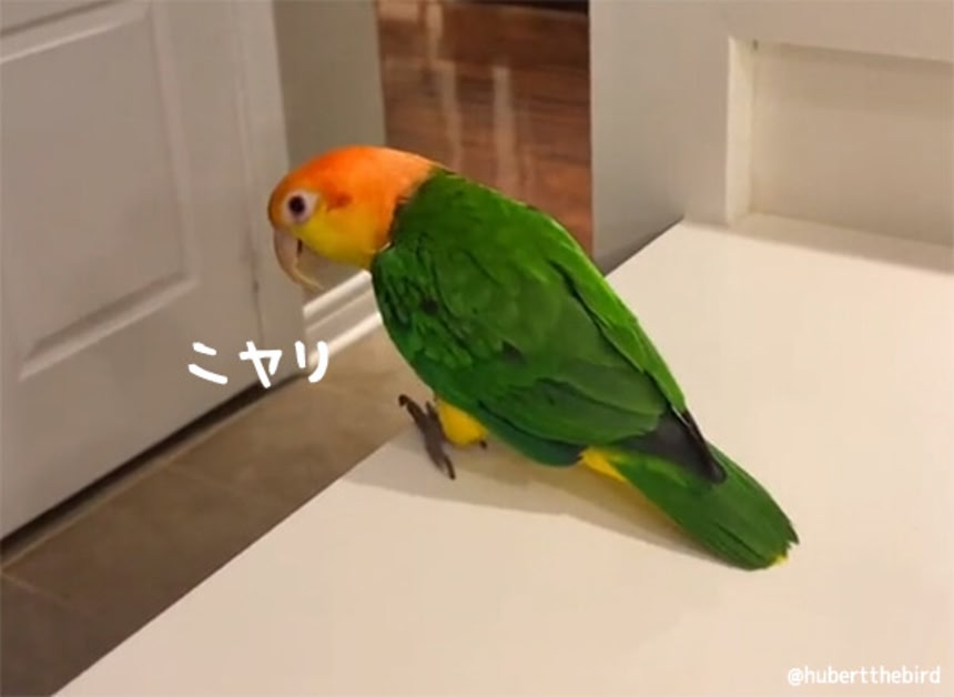 猫かと思ったらインコだった。次から次にキッチンテーブルから物を落とす遊びに夢中