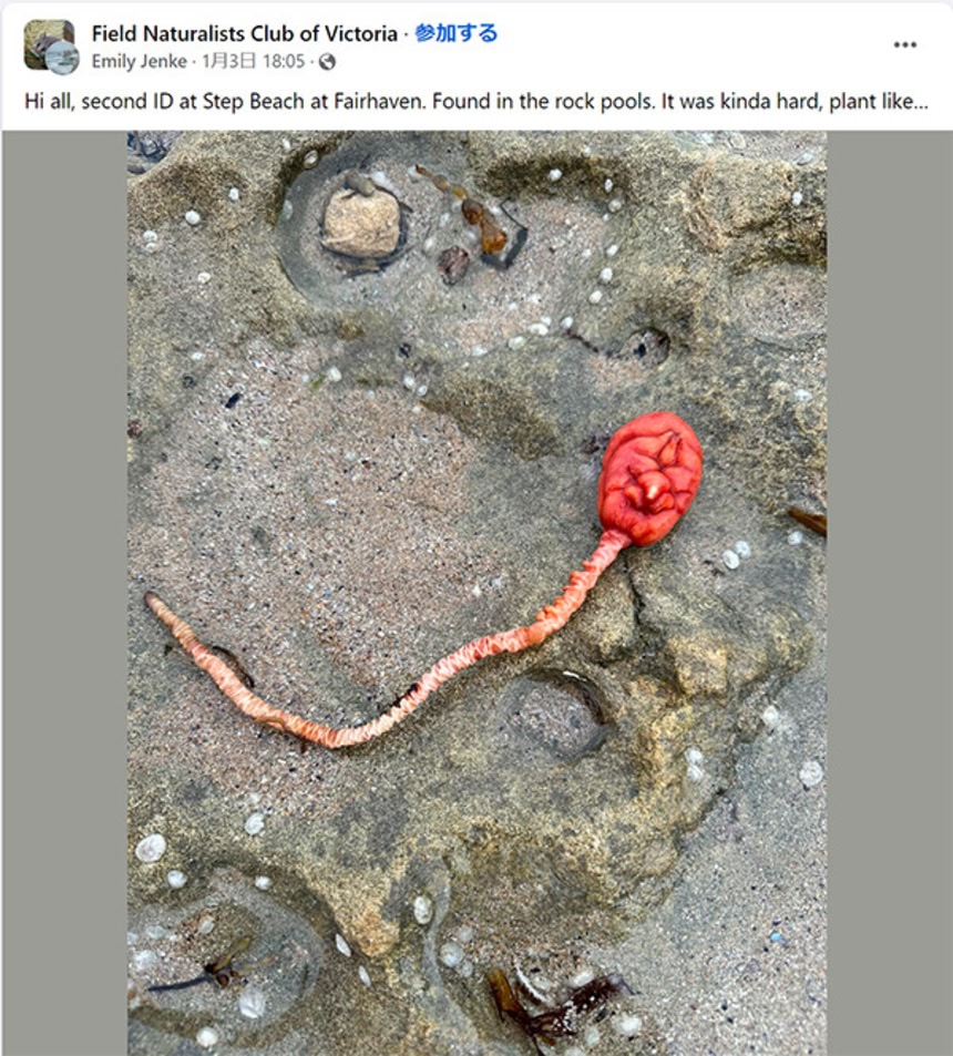 赤の丸っぽい部分にはしわがよっていて、まるで顔のようにも見える。摩訶不思議なこの生物の正体が知りたかった女性はFacebookグループに投稿し、「これは何?」と画像と共に投稿した。