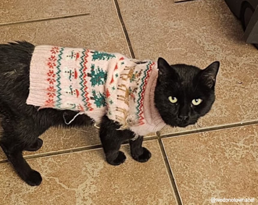 家族は他に行きたい場所があるんじゃないかと思っていたそうだが、ある日のこと、黒猫はかわいらしいセーターを着て帰ってきた。