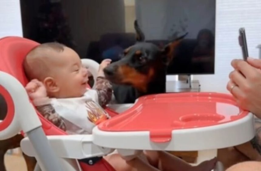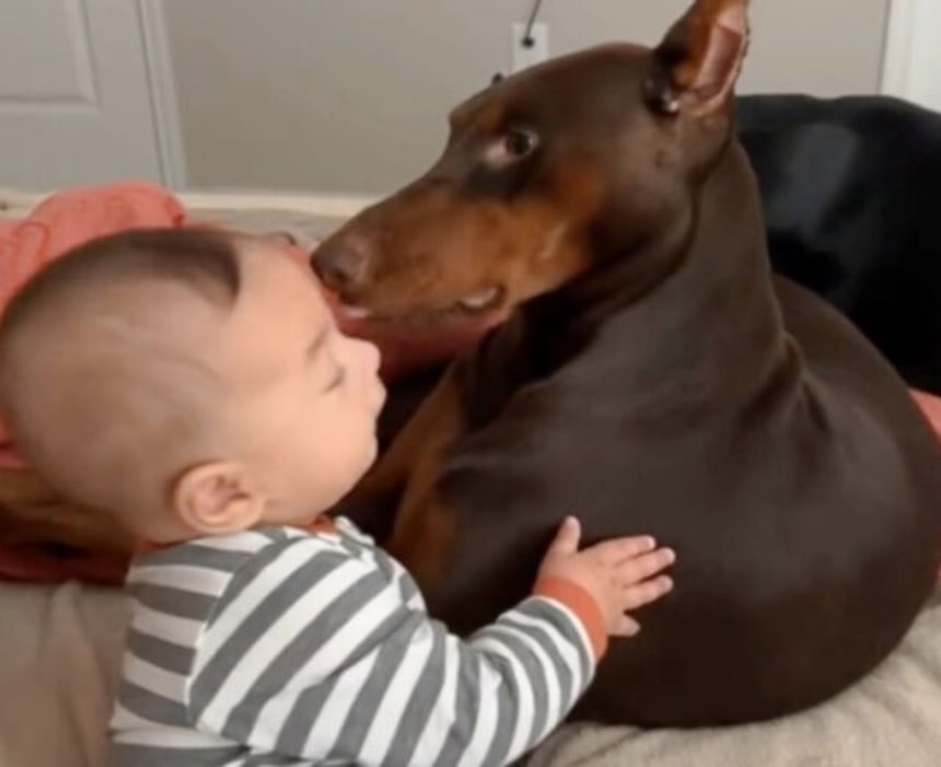 でもそんなドーベルマンも、ご主人の赤ちゃんにはメロメロみたいだ。今日は赤ちゃんと2匹のドーベルマンたちの仲良しっぷりを見てみよう。