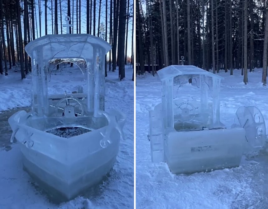 今月半ば、氷や雪の彫刻家イヴァン・カルピツキーさんが、巨大な氷のブロックから作った氷の船をSNSでお披露目し、実際に乗ってるところもシェア。