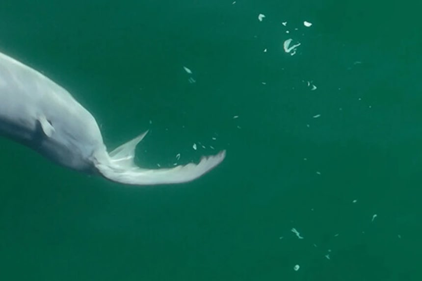 画像を拡大し、スローモーションにして確認したところ、そのサメの体から何やら白い膜のようなものが剥がれ落ちていることがわかった。