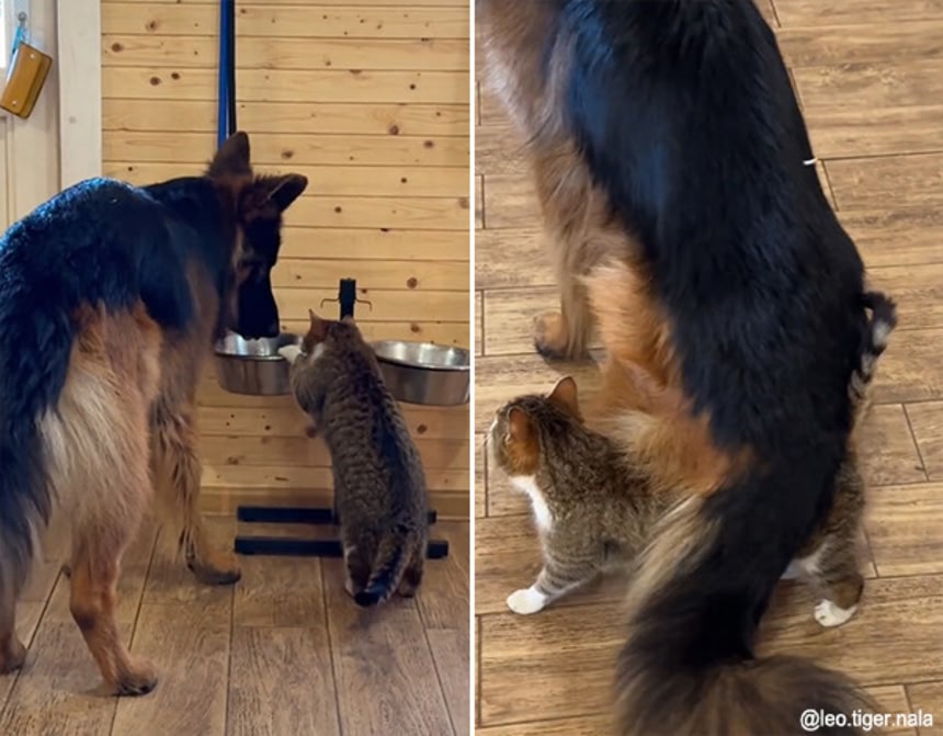 大きな犬たちをこよなく愛する猫は、どうしても会いに来ちゃうのだ。特にジャーマンシェパードのタイガーのことがお気に入りで、彼の近くを離れようとしない。タイガーも猫のことをとてもかわいがっている。