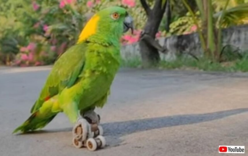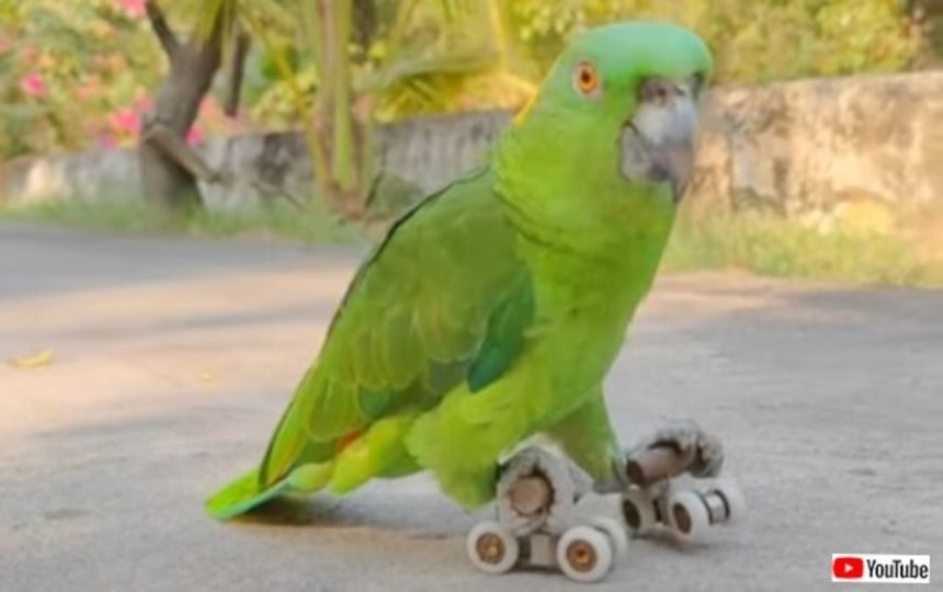 今日ご紹介しようと思っているのは、ローラースケートを乗りこなすキエリボウシインコだよ。上手にスケートを使って移動する様子をぜひ見てみて!