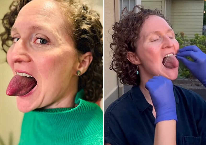 この画像を大きなサイズで見る測り方は、歯科医が彼女の舌にデンタルフロスを巻きつけ、あとでフロスの長さを測るというものだ。